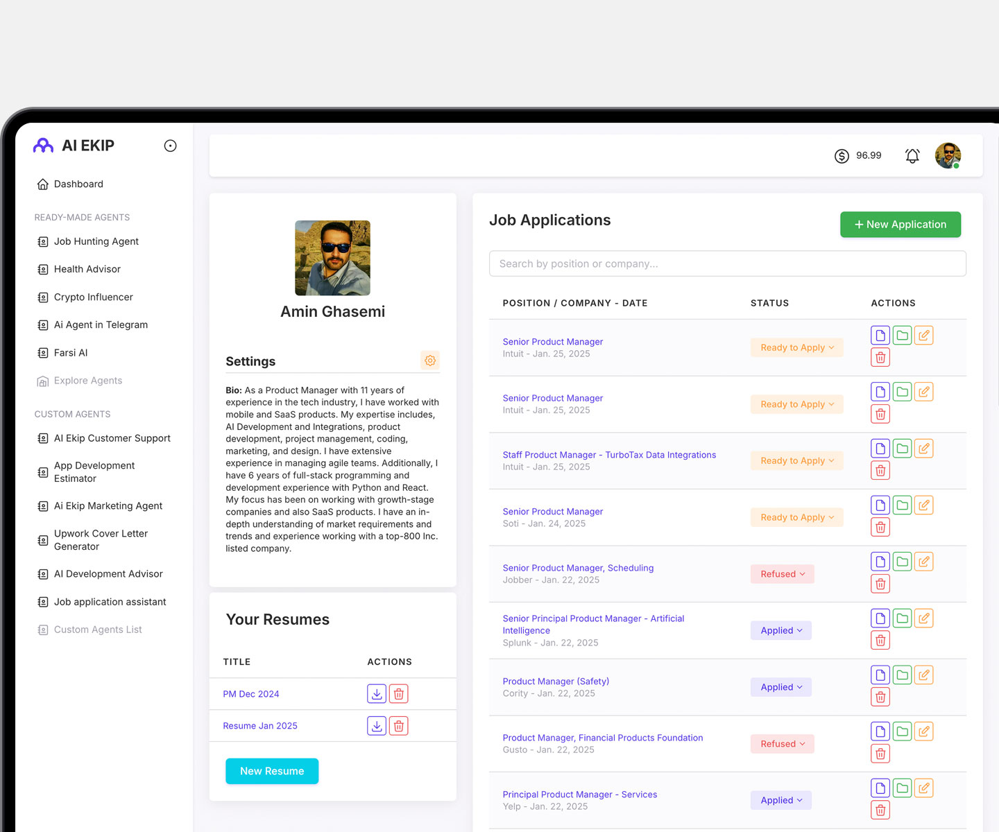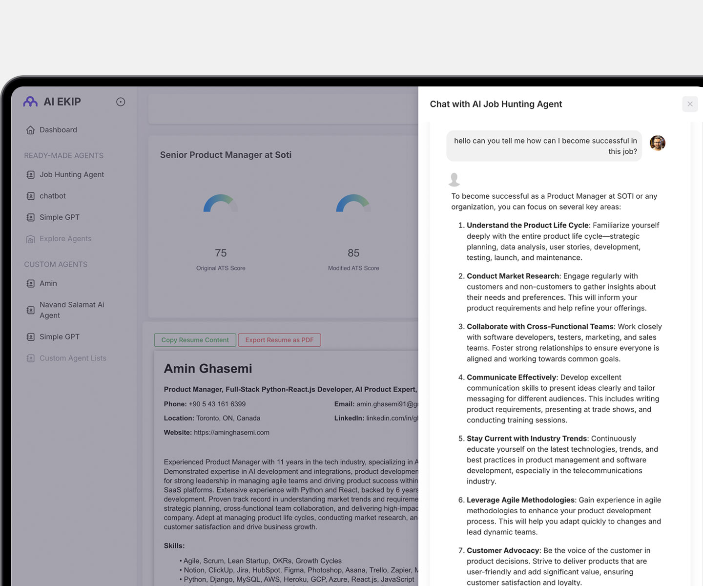 Ai Ekip resume builder ai agent supports you what you need today to get your next job easily.
