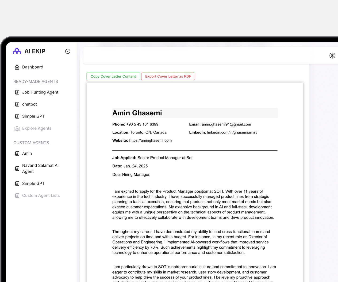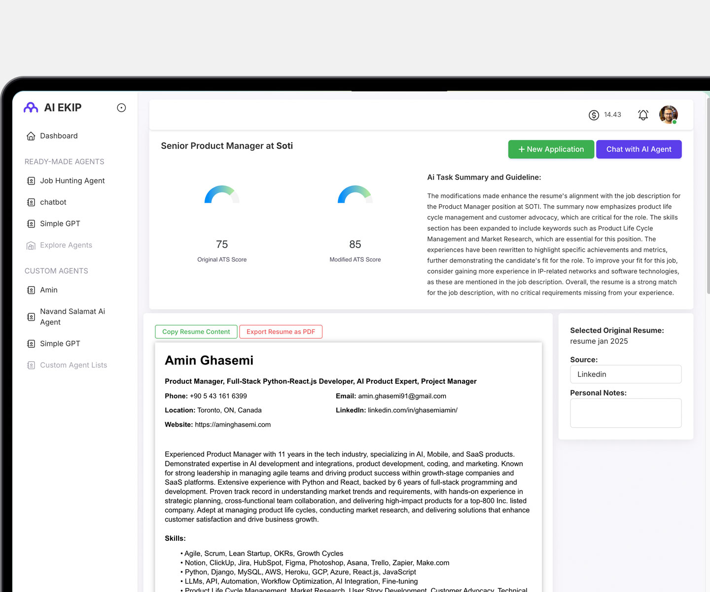 AI Ekip’s resume builder transformed my CV into a job-winning document. The AI agent guided me through applying to jobs, ensuring my resume was always perfectly aligned with each position. I landed my dream role in just a few weeks!